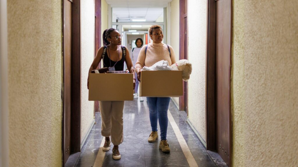 Also, don’t forget to work with your roommate(s)—even if you’ve never met them. Schedule around one another so you aren’t moving in simultaneously, which usually causes significant frustration. Have everyone agree to bring certain appliances and features so you can conserve space and energy. And share contact details to keep in touch on your moving day!